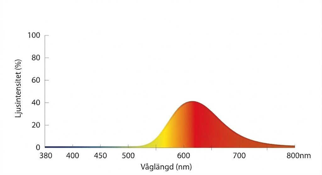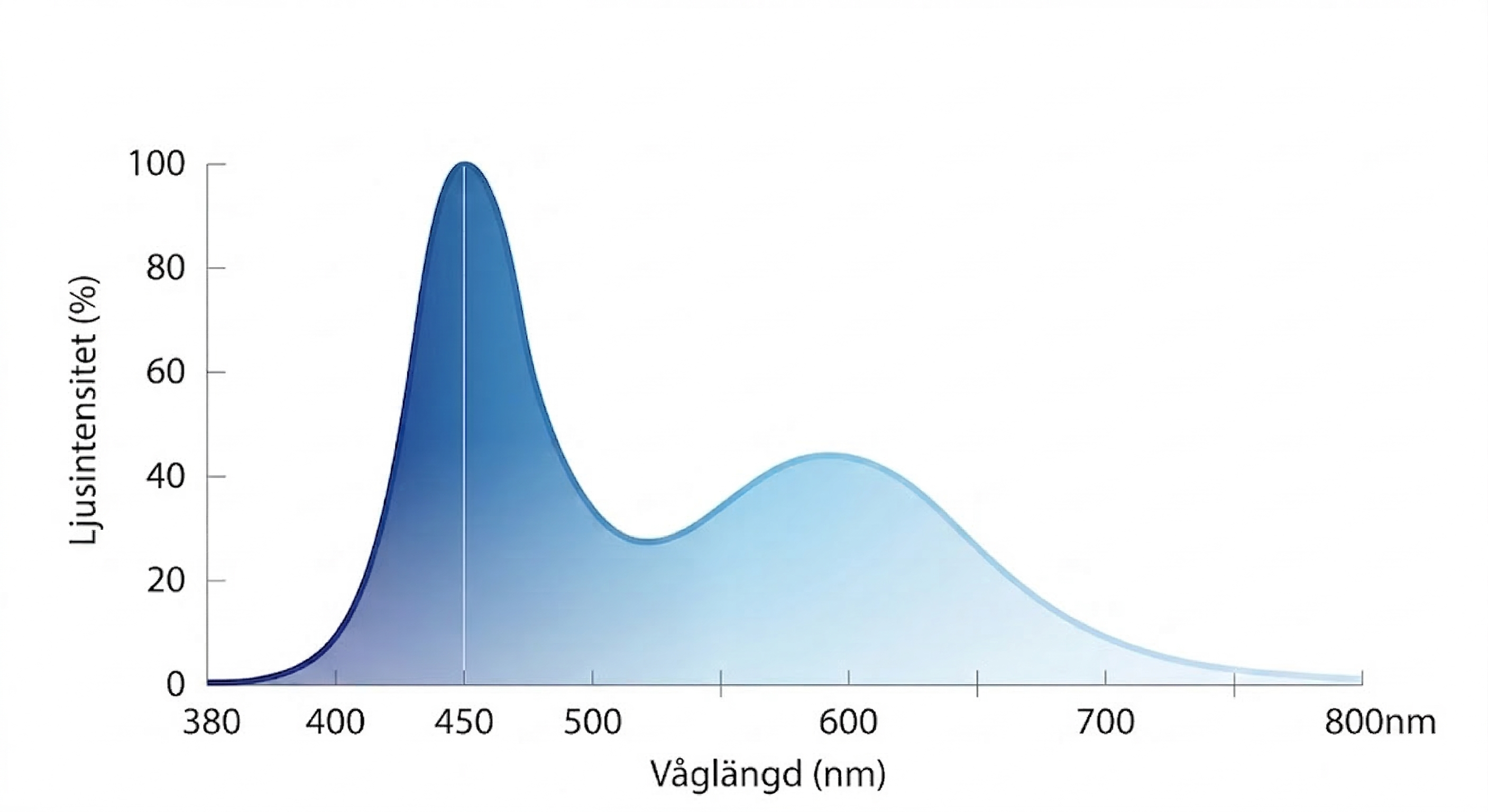 Dra i slidern för att se skillnaden. Skärmar avger en hög andel blått ljus, särskilt i området runt 450nm.