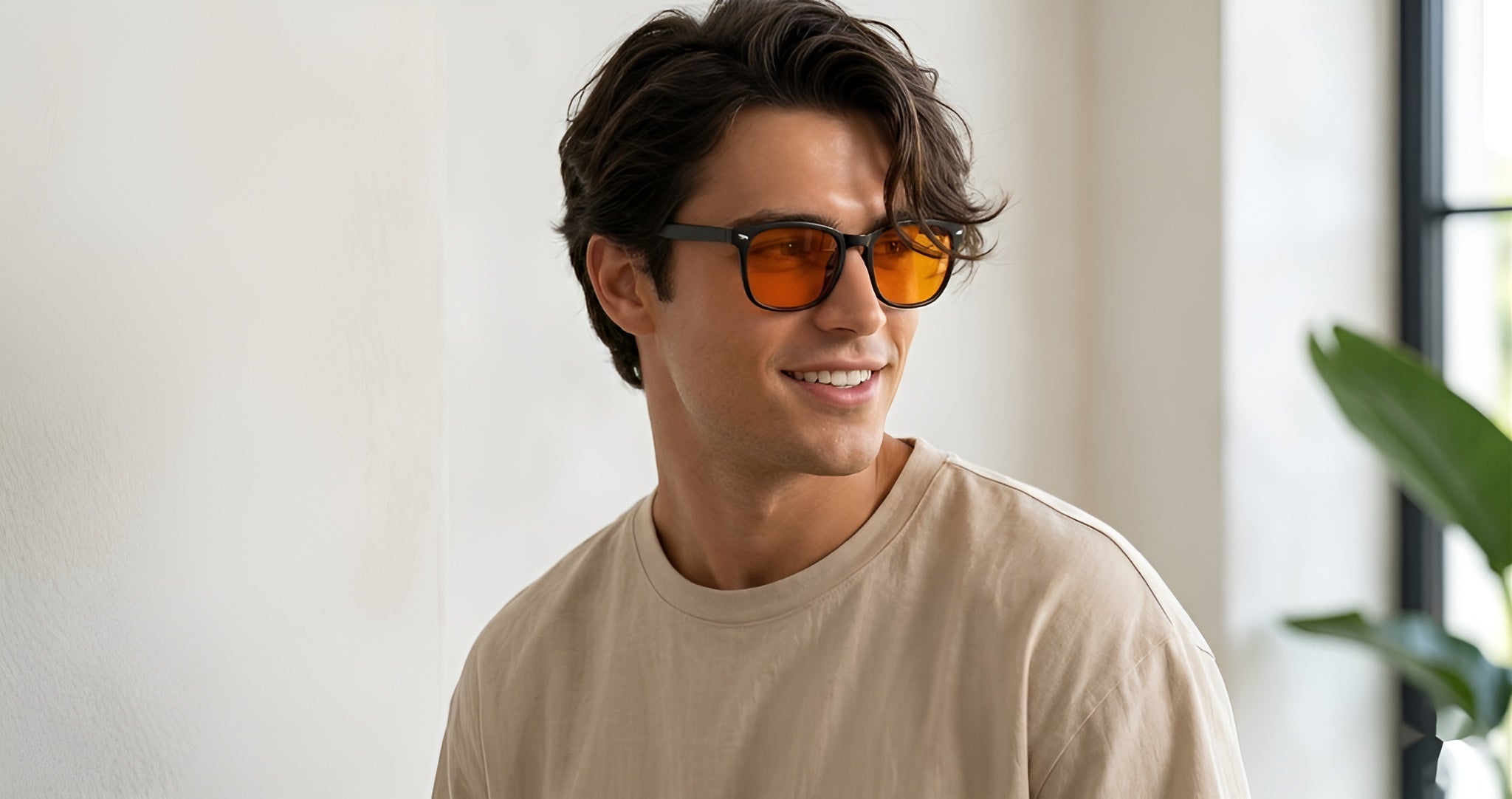 Orangelinsen filtrerar skärmljuset under dagen – så ögonen håller hela vägen hem. Lätt nog att bära från morgonmötet till sista mejlet.